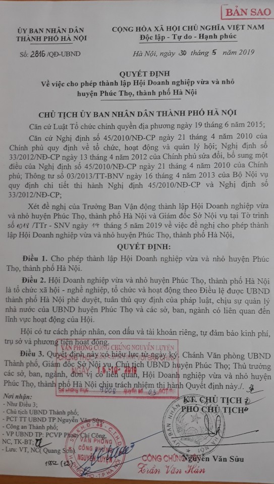 Quyết định thành lập Hội DNNVV H.Phúc Thọ